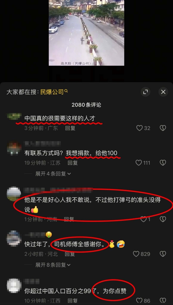 許多大陸網民留言點讚:「人才」「打得真準」「我想給他捐款」「司機師傅感謝你,這回不會(被捕)違章了」。