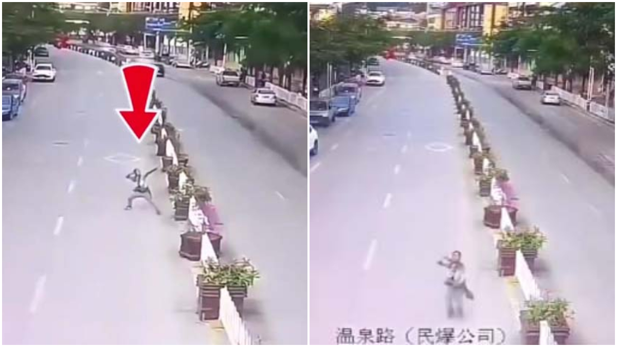 網傳的監控影片帶有簡體字「溫泉路(民爆公司)」字樣。影片顯示,一名男子手拿彈弓,走在馬路中央,先是對著左側建築拉弓瞄準,發射一顆彈丸。隨後,他又往前緊跑幾步,將拍攝影片的攝影機打壞。鏡頭大半的影像立刻模糊,只能看到玻璃裂紋。