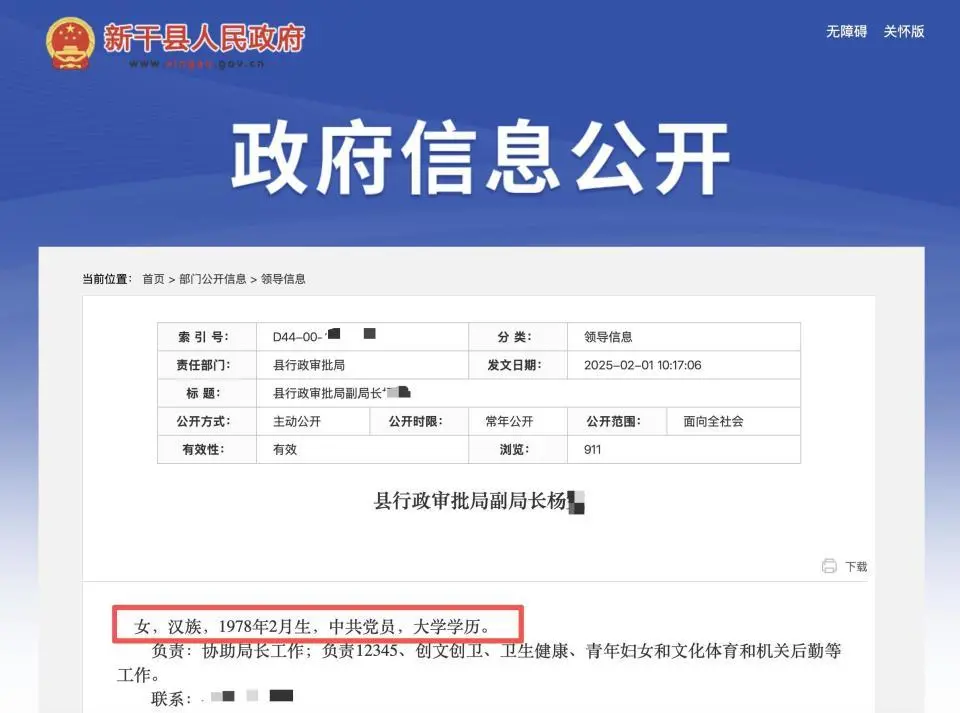 華商報大風新聞報道,該則官員任前公示顯示,楊某出生於1982年7月,無黨派,而在新幹縣政府官網行政審批局訊息公開頁面中,楊某出生於1978年2月,政治面貌是中共黨員,並下附了楊某的辦公聯繫電話。