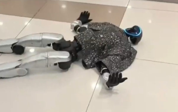 網傳的影片顯示,在商場一處空地,有不少顧客在看機械人表演,一名老人坐在地面站不起來,有人試圖把老人攙扶起來,但沒有成功。不遠處,一台人形機械人仰面倒在地上,雙手攤開。