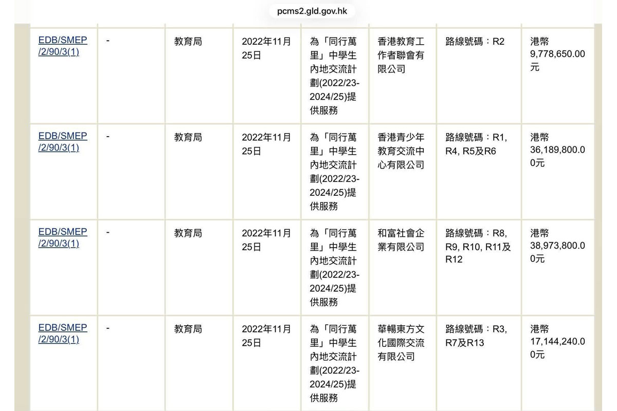 昨日談香港學校「內地交流團」這盤大生意,我以為負責招標的教育局沒公開承辦機構的資料,但有讀者告知,在「香港政府一站通」可以找到教育局批出什麼合約。於是我按圖索驥,查到最近五年教育局向哪幾個機構批出「內地交流團」合約,名單跟我昨天寫的幾乎全同。