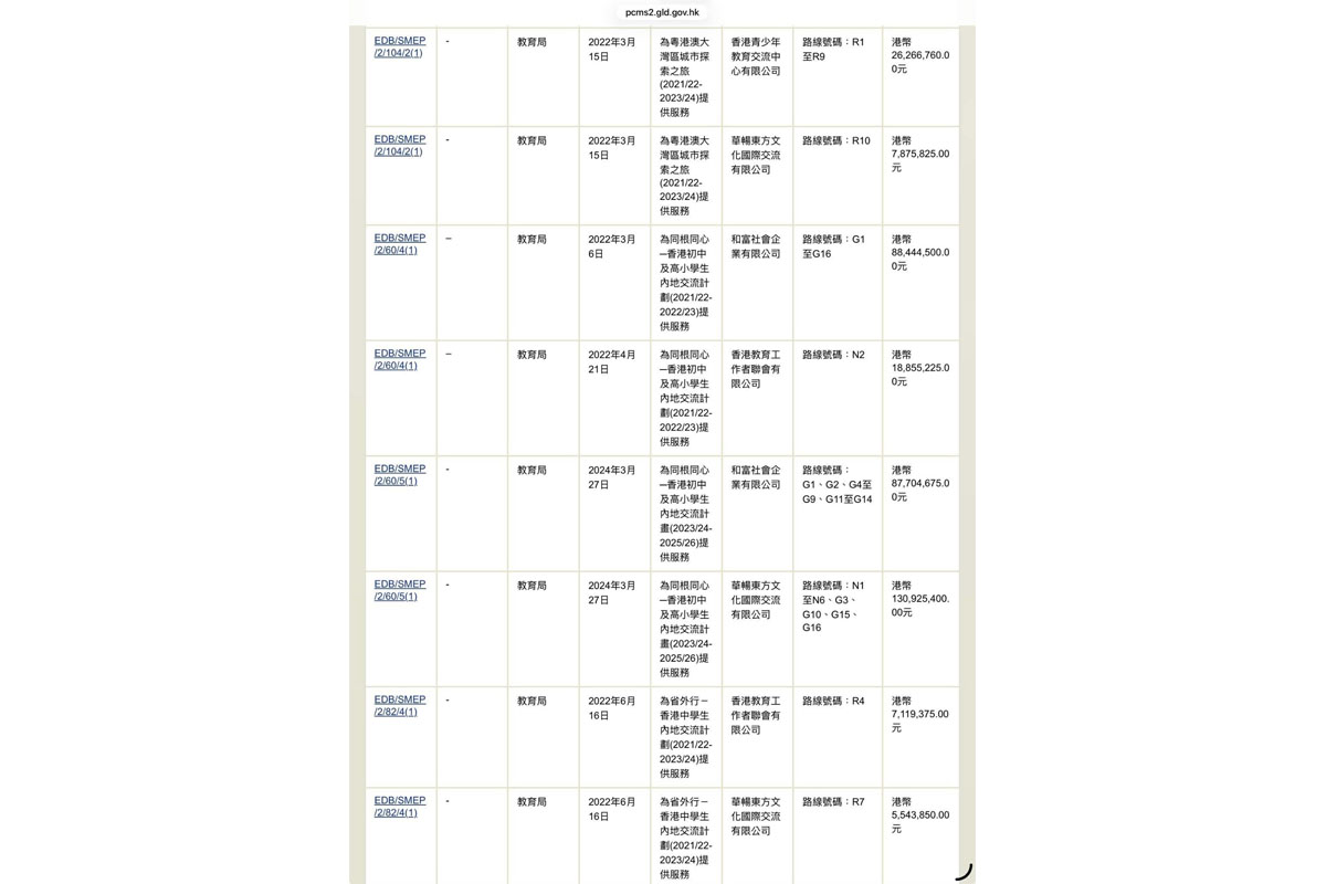 近五年,教育局分別向六間公司批出價值港幣572,932,660元的合約,讓它們組織中小學生「內地交流」活動。當中以「和富社會企業」所獲資助最多,約 2 億 5,300 萬元,其次是「華暢東方文化國際交流有限公司」,獲得約 1 億 8,200 萬元,之後是「香港青少年教育交流中心」獲得約 8,250 萬元,「香港教育工作者聯會」獲得約 4,450 萬元,此外「百利國際文化交流中心」與「亞洲旅行社」獲得的資助總額,分別逾720萬元及逾350萬元。