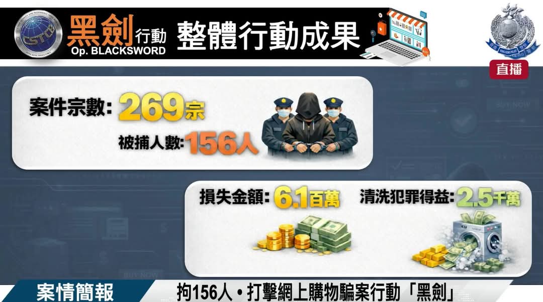 針對近年猖獗的網上購物騙案及相關洗黑錢罪行,警方於今年1月12日至30日期間,展開代號「黑劍」的執法行動。網絡安全及科技罪案調查科今日(6日)公布行動成果,共拘捕156人,包括108男48女(年齡介乎14至75歲),涉及269宗網購騙案,受害人總損失金額達600萬元。