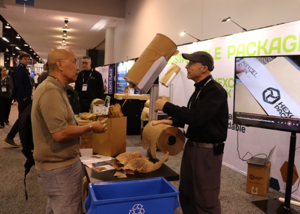 來自亞利桑那州的「六角形包裝」(Hexclpack)有限責任公司的大衛‧古德里奇(David Goodrich)介紹了符合環保的牛皮紙包裝材料:「我們使用加拿大木材行業的廢棄木料,比塑膠更有保護性,可以包裝食品、醫療用品、酒類等各種各樣的東西。我們的客戶包括亞馬遜、Target、沃爾瑪以及蘋果公司等等。」
