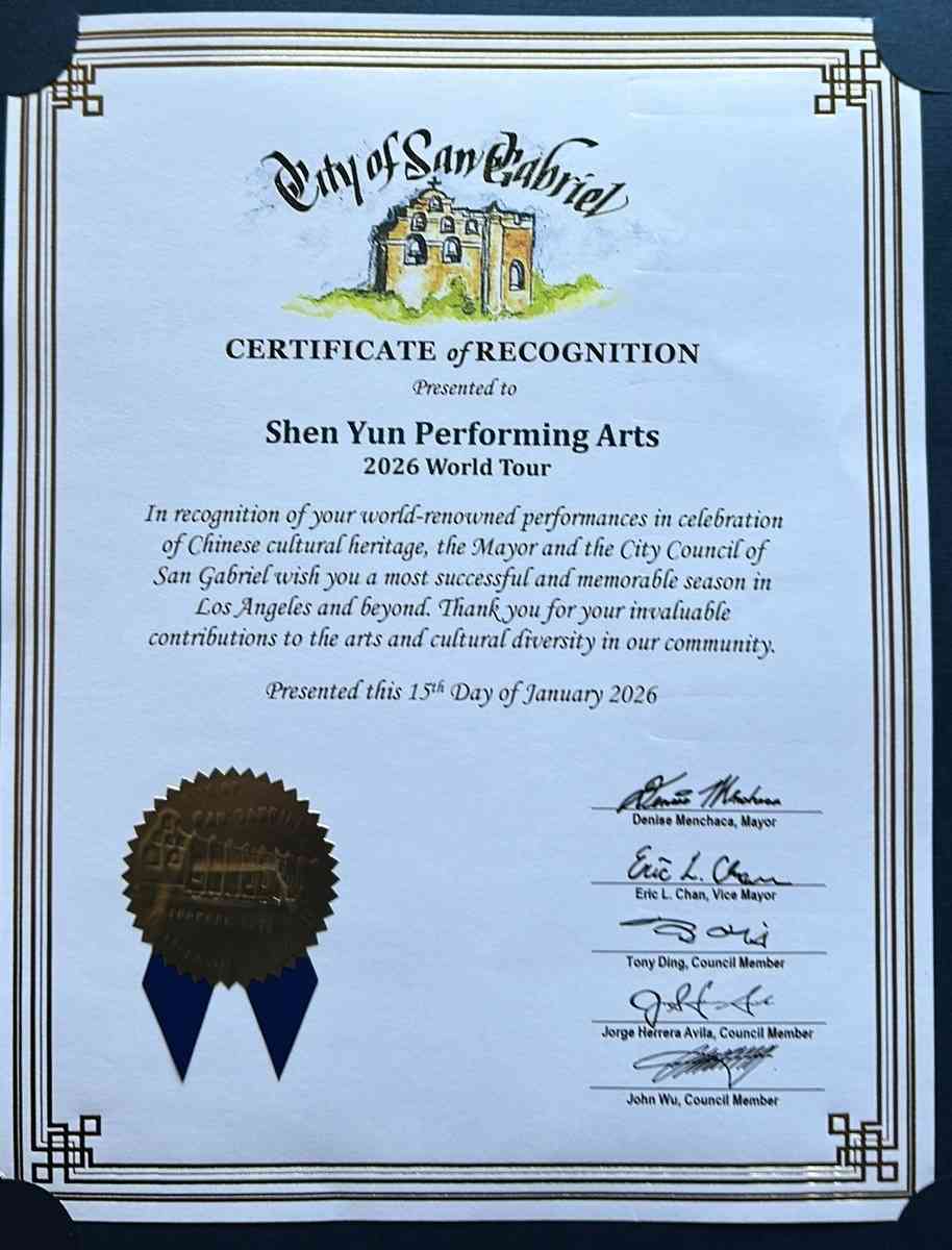 聖蓋博市長、全體市議會也為神韻發來嘉獎令:「表彰您在弘揚中國文化遺產方面享譽世界的傑出演出,祝願您在洛杉磯及其它地區演出季取得圓滿成功,留下難忘的回憶。感謝您為我們社區的藝術和文化多樣性做出的無比寶貴貢獻。」