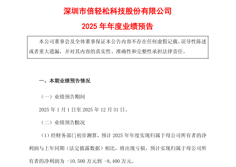 公告數據顯示,2025年,倍輕鬆淨虧損8,400萬元至1.05億元,同比下跌超過900%。