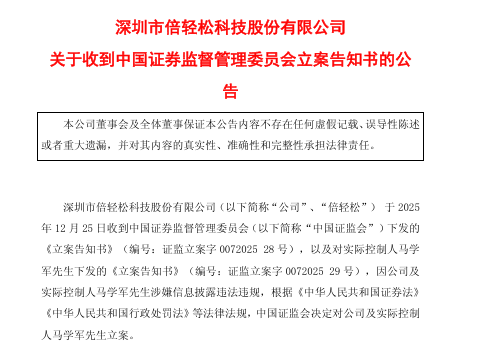 2月6日,倍輕鬆發布了《關於實際控制人收到中國證券監督管理委員會立案告知書的公告》。公告表示:2026年2月4日收到中國證監會對實際控制人馬學軍下發的《立案告知書》,因馬學軍「涉嫌操縱證券市場」,對其立案。