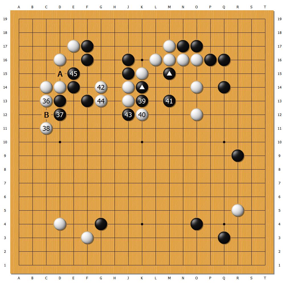 本局申真諝猜錯單雙,一力遼執黑先行。序盤,二人在上方短兵相接,但申真諝錯失吃掉黑三角二子的機會(見下圖),埋下禍根,雙方形成混戰。而白38、44兩步疑問手,留下A、B兩個「缺口」,使左邊棋形斷點過多,無從發力。