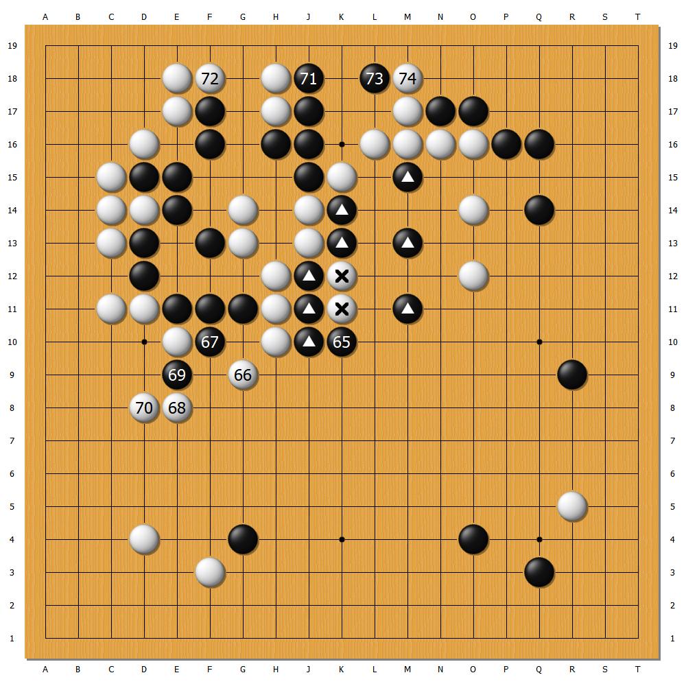 隨著棋局進展,黑65拐,愉快地吃住中腹白二子,基本保大龍無生死之虞,並追殺兩邊白棋孤子。申真諝只有招架之功,毫無還手之力,白勝率也跌至個位數。