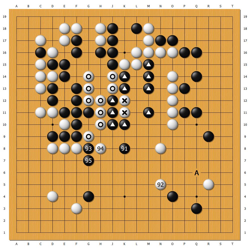 但關鍵時刻,一力遼行棋不夠簡明。黑93如能弈在A位,借攻擊對手大龍順勢得利,吃掉白右下角一子,使邊空成片,申真諝恐難翻盤。但在進入讀秒的情況下,黑93斷,選擇將白圓圈大龍捲入戰事,實非明智之舉,成為本局的敗因。