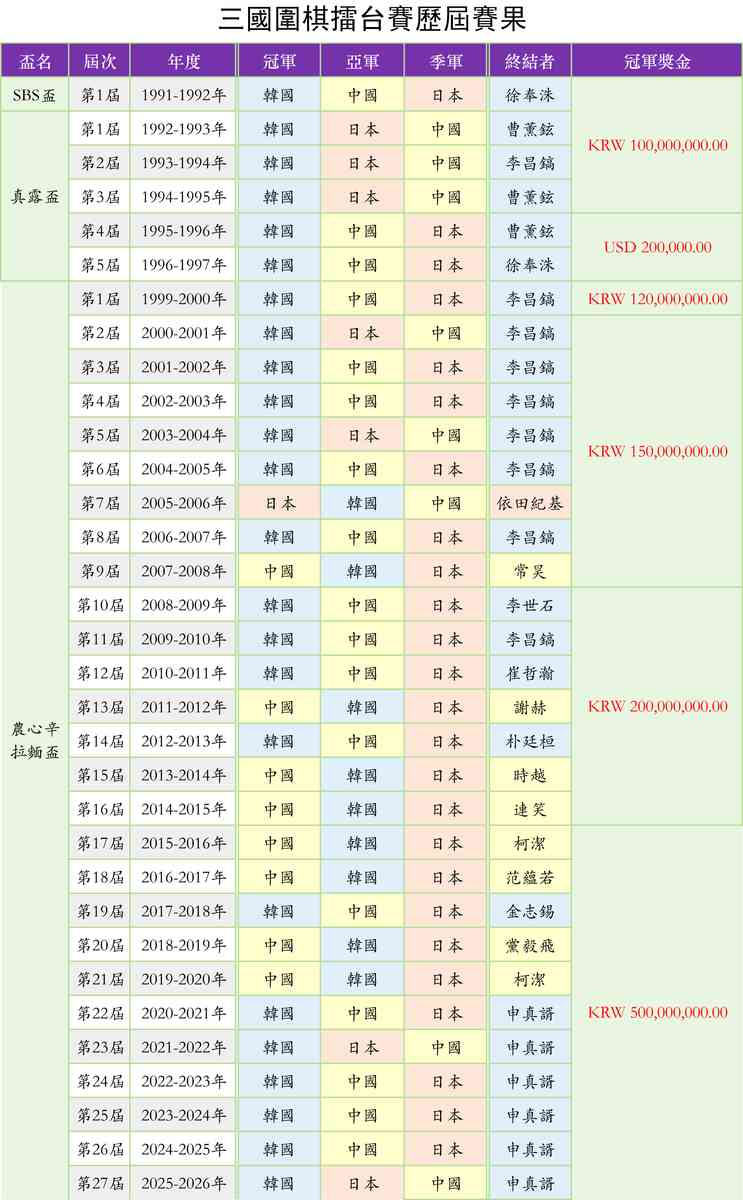 該賽事由農心株式會社贊助,韓國棋院主辦,採用韓國圍棋規則,黑棋貼6.5目。