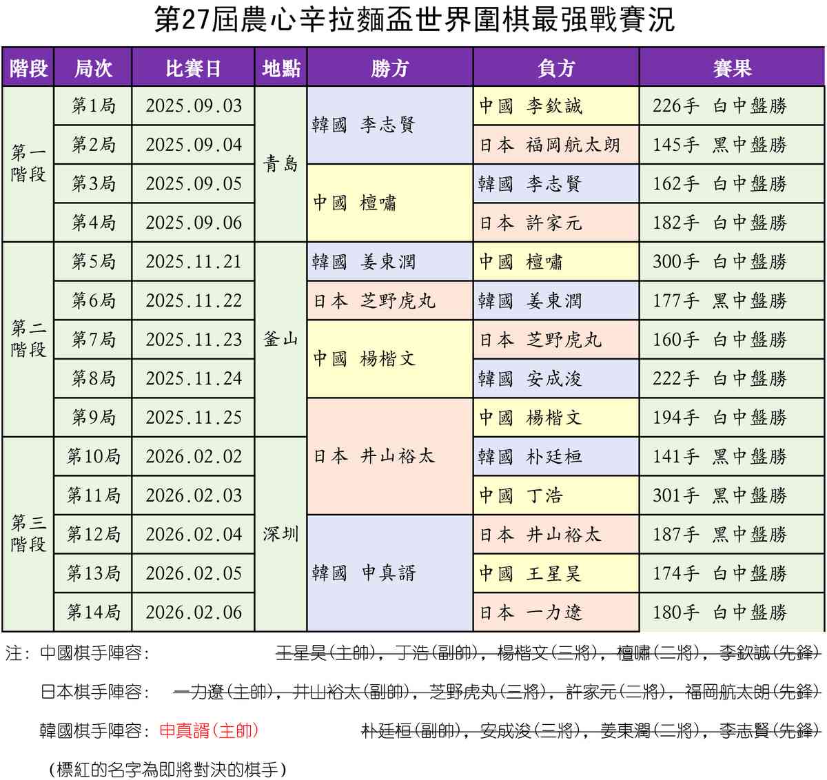 2月6日,第27屆「農心盃」三國圍棋擂台賽上演終極一戰,韓國隊主教練申真諝九段險勝日本隊主教練一力遼九段,達成震古鑠今的跨屆21連勝,憑藉一己之力幫助韓國隊實現六連霸。