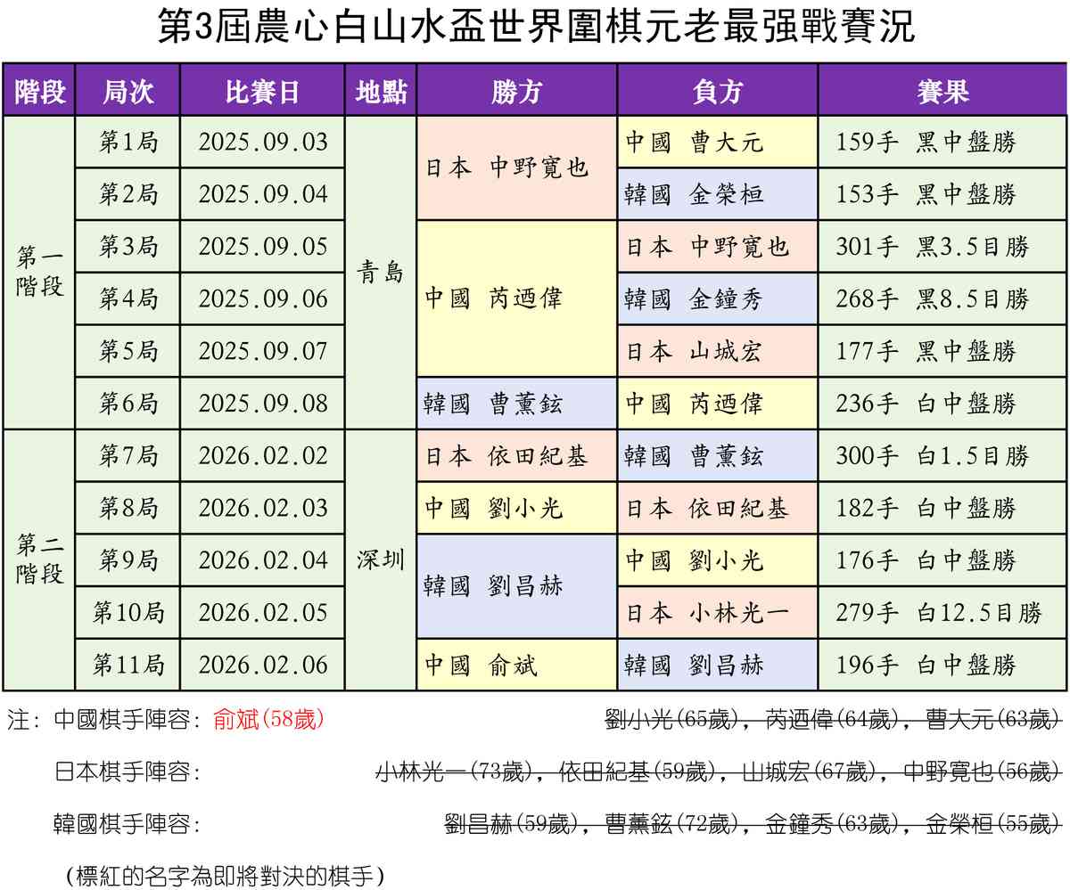 同日稍早進行的三國圍棋元老擂台賽,4日剛剛續聘為中國圍棋隊總教練的俞斌九段意氣風發,將二連勝的韓國元老隊主教練劉昌赫九段打下擂台,幫助中國元老隊成功衛冕。