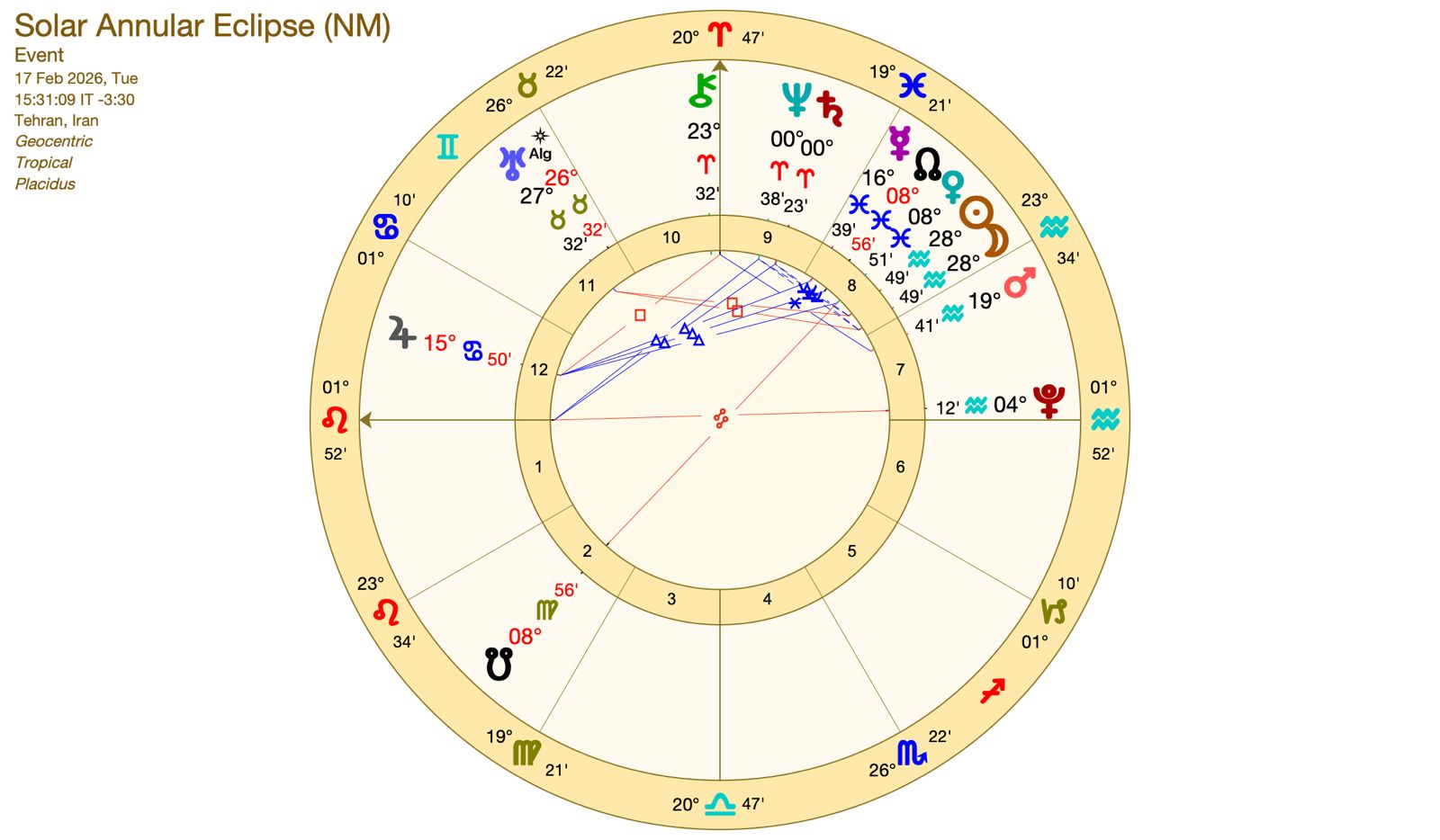 由於本次日蝕的上升星座為獅子座,而第二宮(經濟)同樣落於獅子,其宮主星太陽在水瓶座與月亮合相,並直接構成日環蝕結構,反覆強調影響將集中於國家本命與財經體系之中。