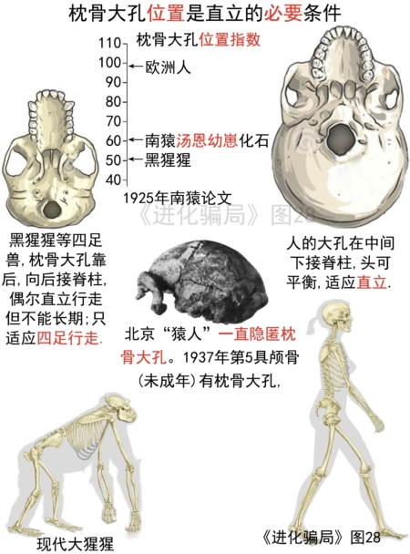 1925年後,枕骨大孔位置就成了衡量直立行走的一個重要指標,後來非洲發現的「人類祖先」大都在這上造假,偽造直立,後文會漸次起底。