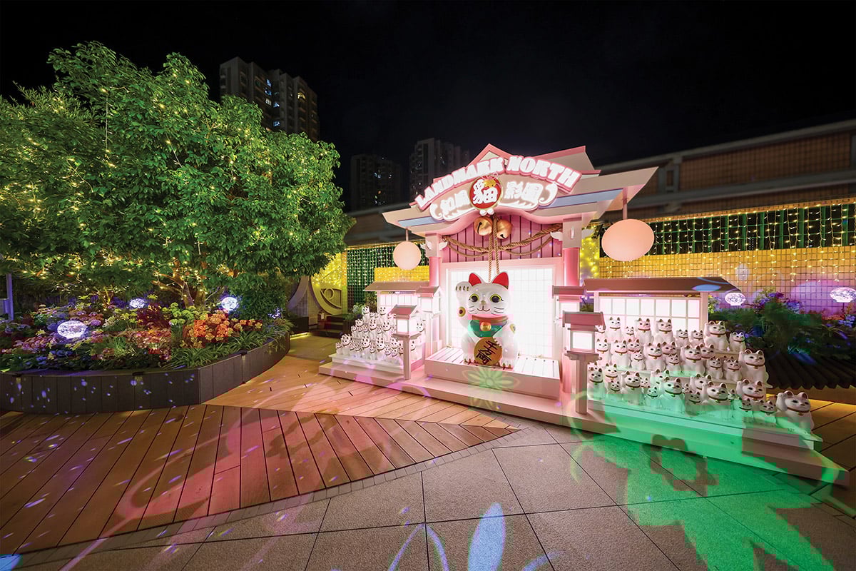 上水廣場的L2 中庭《逗福貓願城》,設有五大福運打卡區,包括「喵來COME 願通天樹」、「招福Make a Wish」、「招財滾滾POWER Ball」、「喜氣福運上上籤」及「福爪招財」。以人見人愛的招財貓結合喜慶燈飾與互動體驗。原創吉祥物「阿吉」以充滿喜氣的「好運面相」登場,寓意新一年福運滿滿,圓潤笑臉凝聚幸福能量。