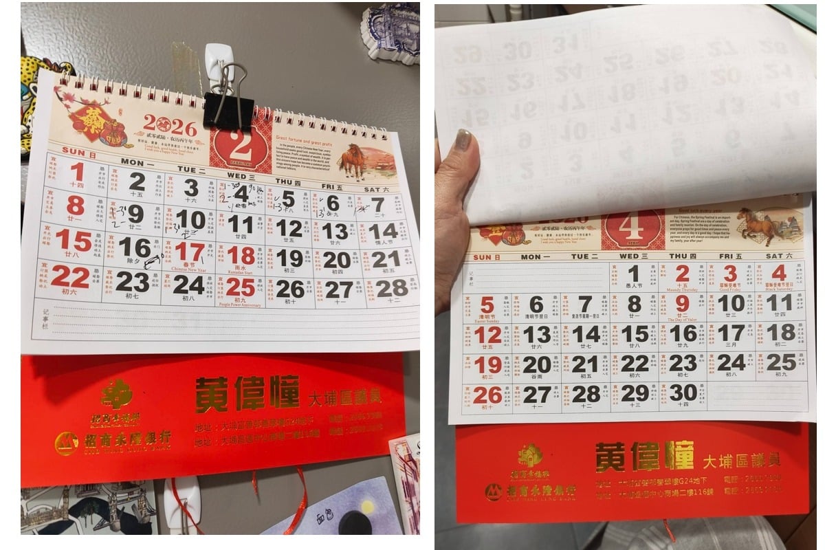 有網民昨日(9日)在Facebook群組「大埔 TAI PO」上載兩張月曆相片,上印有民建聯「黃偉憧大埔區議員」、「招商幸福部」、「招商永隆銀行」字樣。其顯示2月17、18日(年初一、二)為「紅日」,但屬於香港公眾假期的年初三(19日)則以普通日子的黑色顯示。當中17日用簡體字標示為「春節」。發帖的網民指,「懷疑自己睇錯好多次,點解香港農曆新年假期唔係放17 、18 、19,2月25號係咩公眾假期。後來發現日曆唔係香港公眾假期。唔知派畀咩街坊睇」。翻查2月25日的「人民力量革命周年紀念」,為菲律賓紀念1986年推翻馬可斯政權的「人民力量革命」的日子。