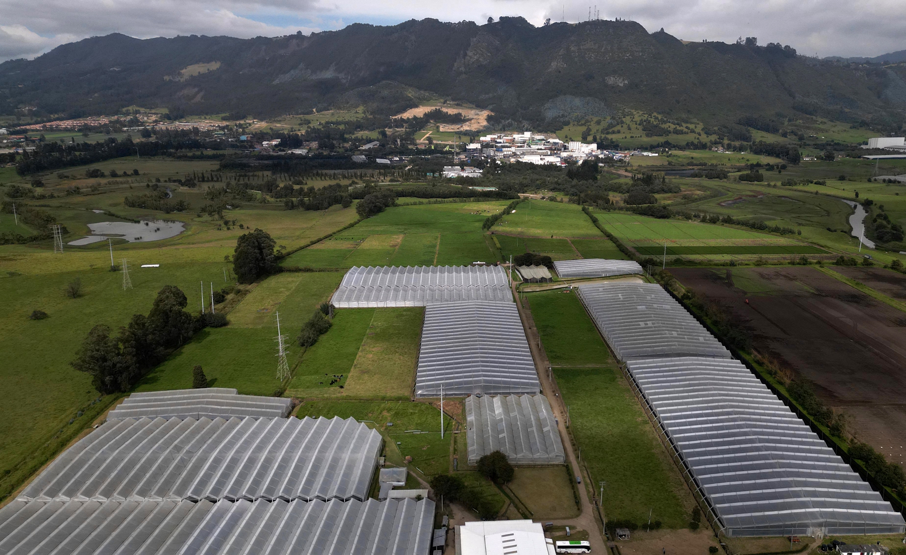 2026年2月3日,波哥大索波市(Sopo)阿尤拉花卉農場(Ayura Flowers)溫室大棚的空拍照。(Raul Arboleda/AFP)