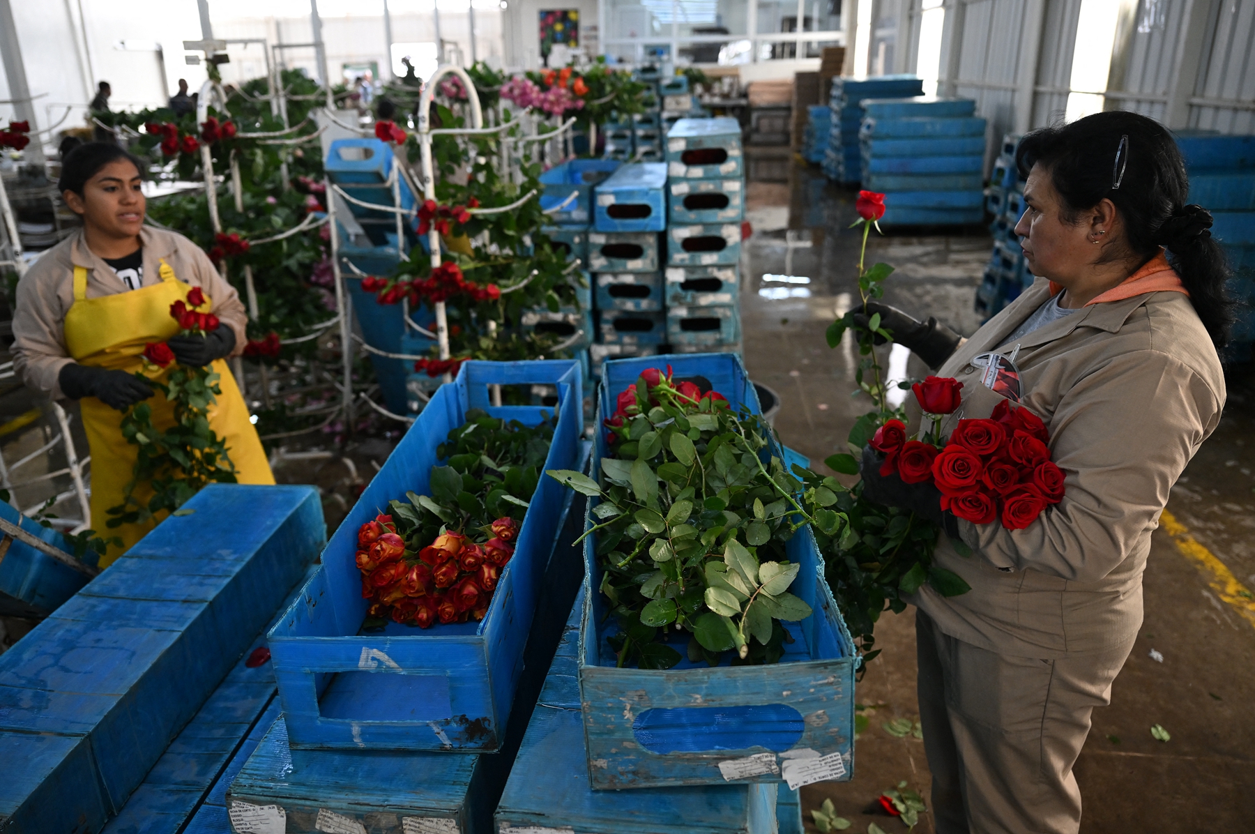 2026年2月3日,波哥大索波市(Sopo),工人們在阿尤拉花卉農場(Ayura Flowers)挑選待出口的鮮切玫瑰。(Raul Arboleda/AFP via Getty Images)