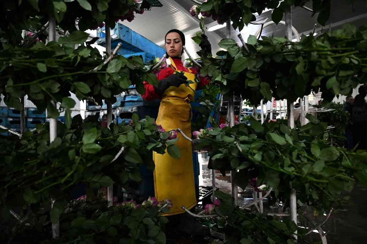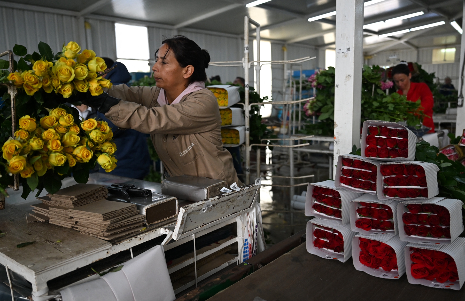2026年2月3日,波哥大索波市(Sopo),一名工人在阿尤拉花卉農場(Ayura Flowers)整理待出口的鮮切玫瑰。(Raul Arboleda/AFP via Getty Images)