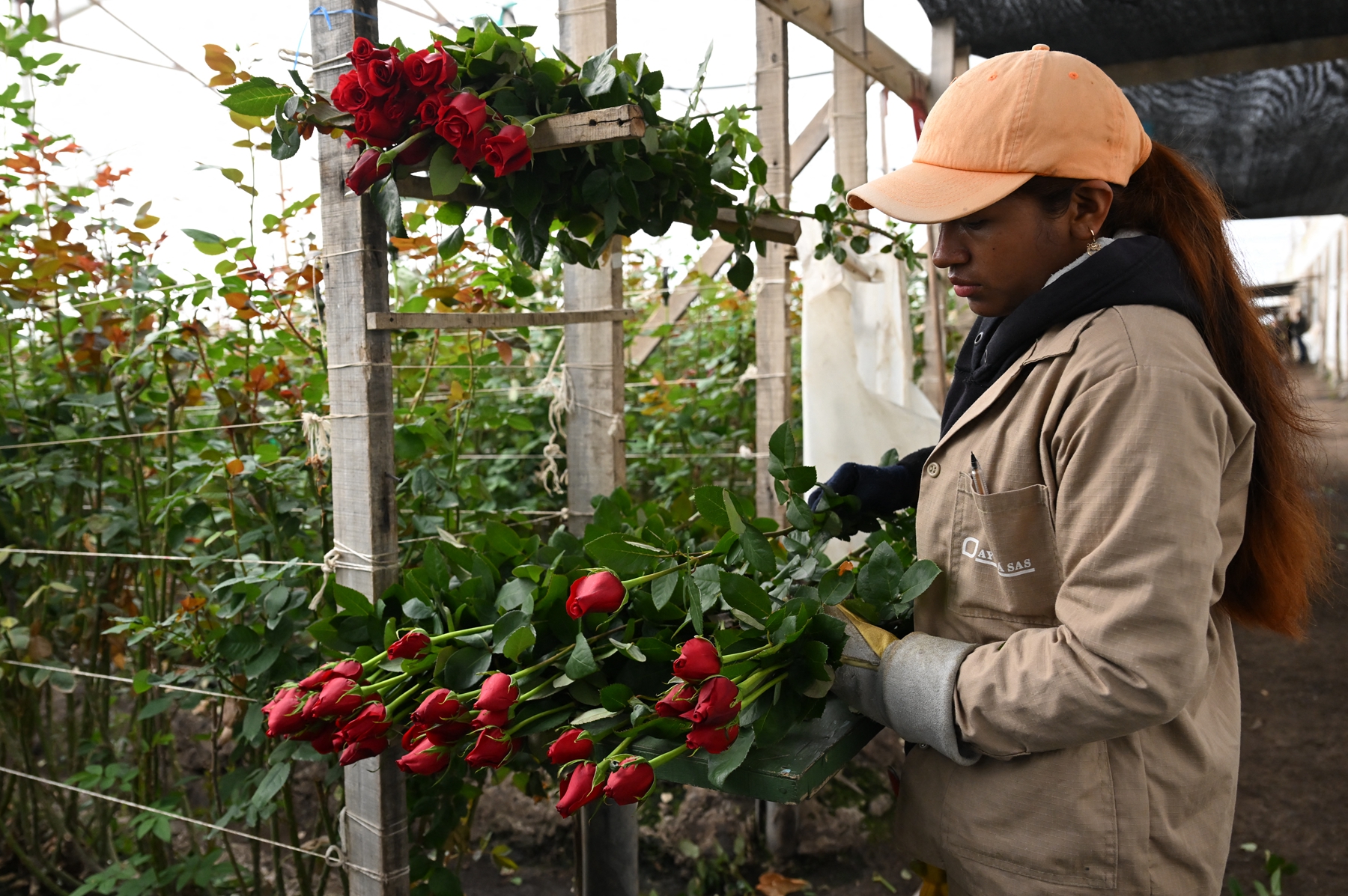 2026年2月3日,波哥大索波市(Sopo),一名工人在阿尤拉花卉農場(Ayura Flowers)採摘待出口的鮮切玫瑰。(Raul Arboleda/AFP via Getty Images)