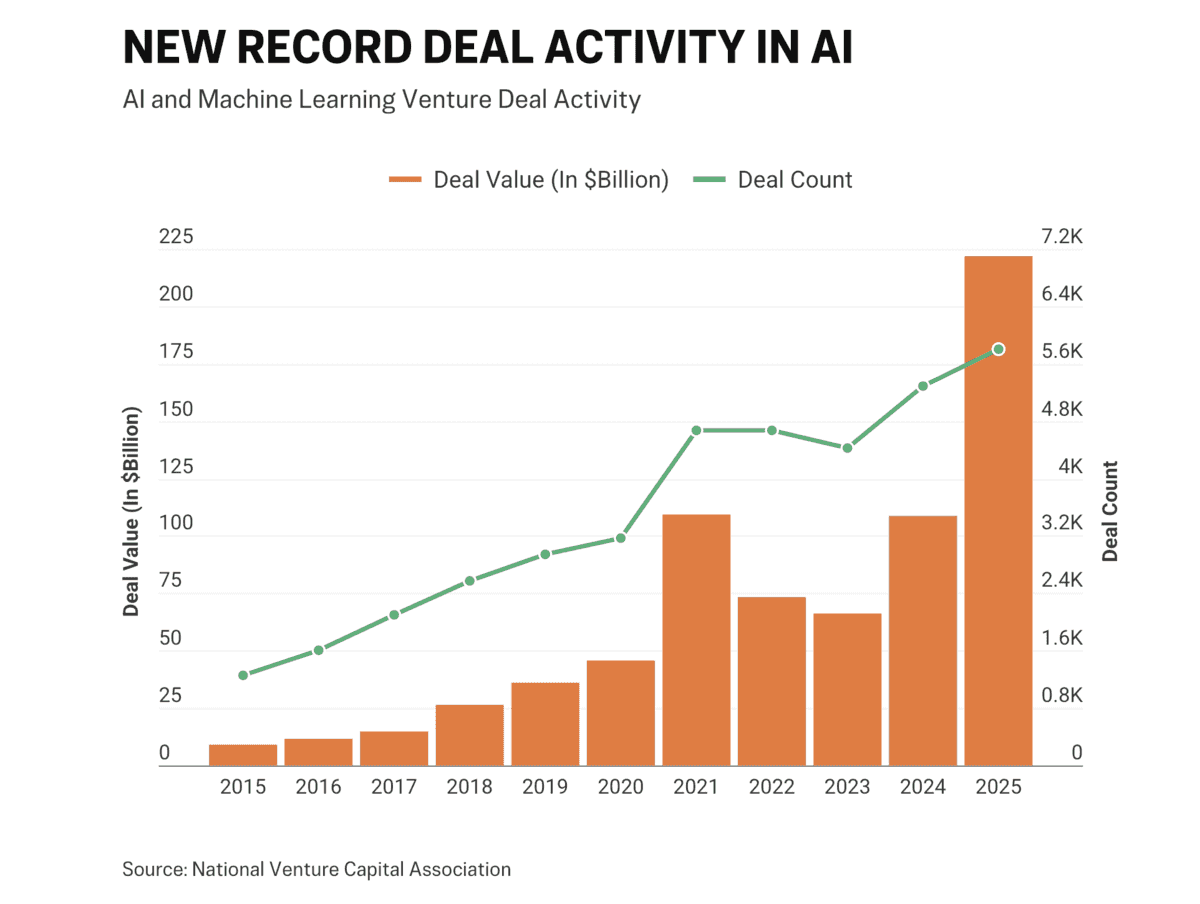 據總部位於維珍尼亞州的美國國家風險投資協會(National Venture Capital Association,簡稱NVCA)預測,到2025年,人工智能和機器學習領域的風險投資交易將佔美國所有風險投資項目資金的65%以上,總額達2,220億美元。這個比例高於2024年的47%和2015年的10%。