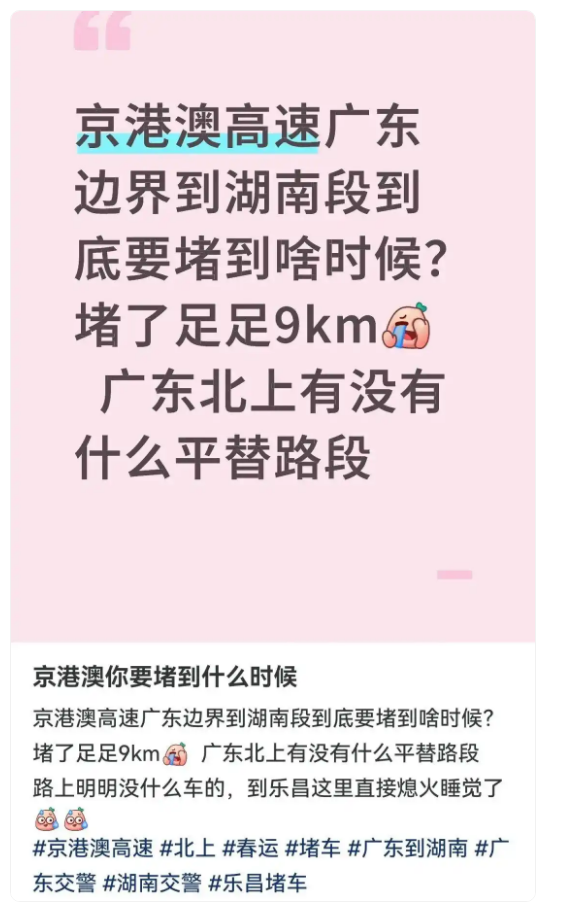 《廣州日報》等多家大陸媒體報道,2026年「春運」首日,多地高速公路迎來返鄉車流高峰,部份路段出現較長時間擁塞。