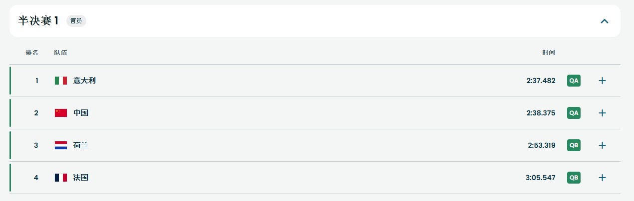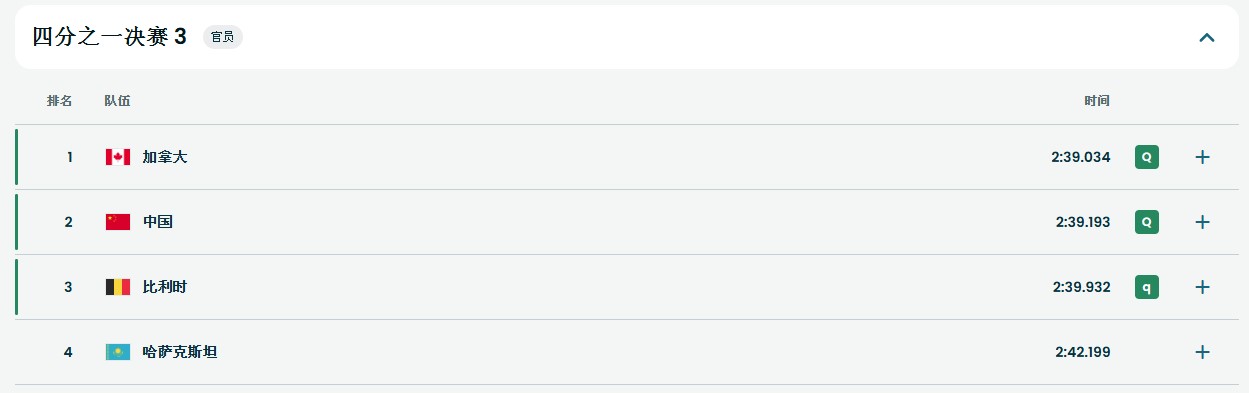 中國隊微調陣容,由公俐(女)、王欣然(女)、劉少昂(男)和孫龍(男)出戰。儘管一度落後,但憑藉孫龍的連續超越以及荷蘭隊的意外摔倒,中國隊以2分38秒375的成績獲得小組第二,成功鎖定A組決賽席位。