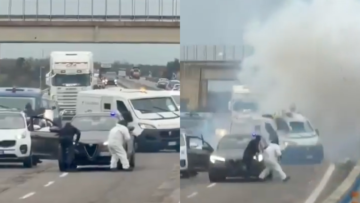 網傳影片顯示,在意大利南部一條公路上,一輛運鈔車被攔截,多名劫匪持槍攻擊運鈔車。「砰」的一聲巨響,運鈔車車門被炸開,現場煙霧瀰漫。