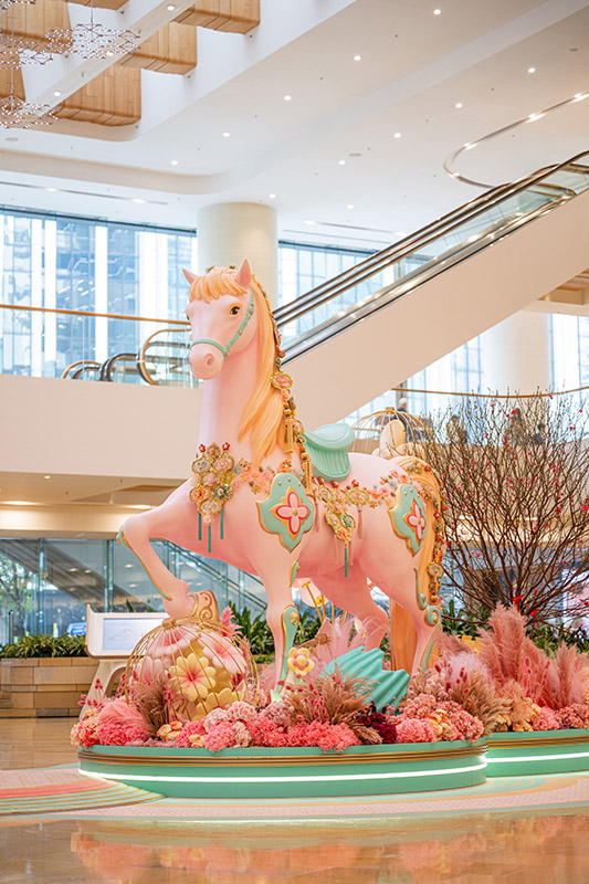 位於L1層的「瑞境盛放」粉彩色系的涼亭與桃花盛放,兩匹幼馬與大家一同迎接馬年。「馬躍呈福」則有一匹3.5米高的粉彩色巨型駿馬配襯花團錦簇,吉祥刺繡,寓意花開富貴,於桃花盛放下蓄勢奔向繁盛新歲。「錦簇駿騰」是朝氣蓬勃的小馬走在步道兩側,穿梭於奇幻的花藝和植物之間,散發新春的活力氛圍。
