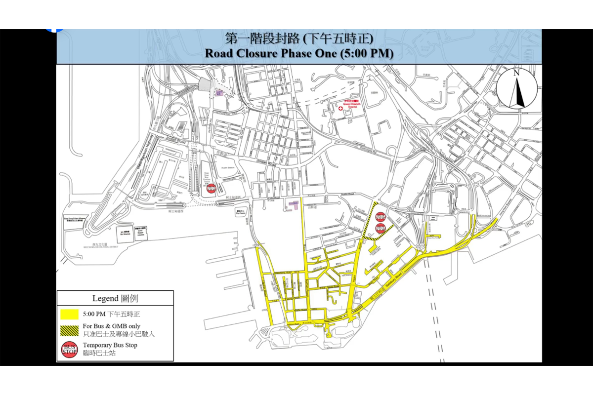 九龍區方面,尖沙咀及西九文化區一帶會從下午約5時起分階段實施封路。此外,東區走廊西行部份路段將於晚上7時45分臨時封閉,除專營巴士外禁止車輛進入。