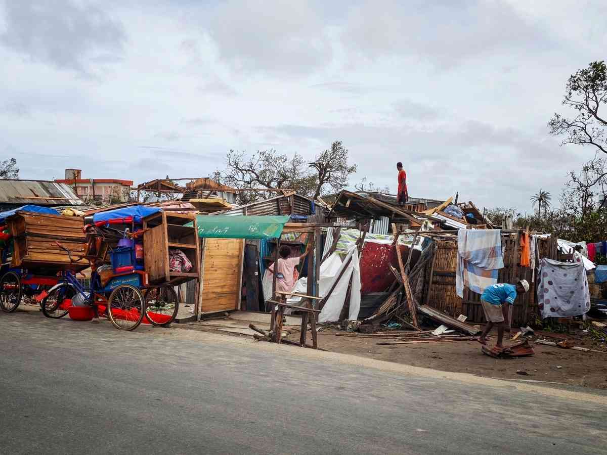 2026年2月11日,熱帶氣旋「格扎尼」(Gezani)過境後,馬達加斯加東部城市圖阿馬西納(Toamasina)的大量房屋和基礎設施遭到破壞或摧毀,到處一片狼藉。(Tsiky Sikonina/AFP via Getty Images)