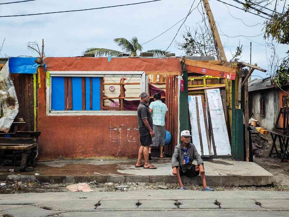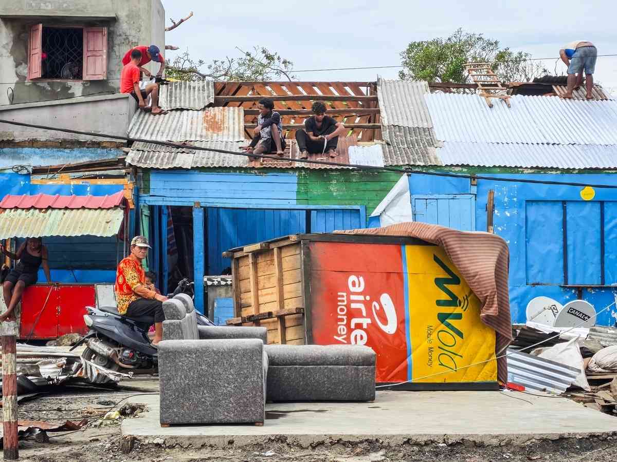 2026年2月11日,馬達加斯加東部城市圖阿馬西納(Toamasina),居民在修繕被強風破壞的房屋。此前一天,這座港口城市遭到熱帶氣旋「格扎尼」(Gezani)的吹襲。(Tsiky Sikonina/AFP via Getty Images)