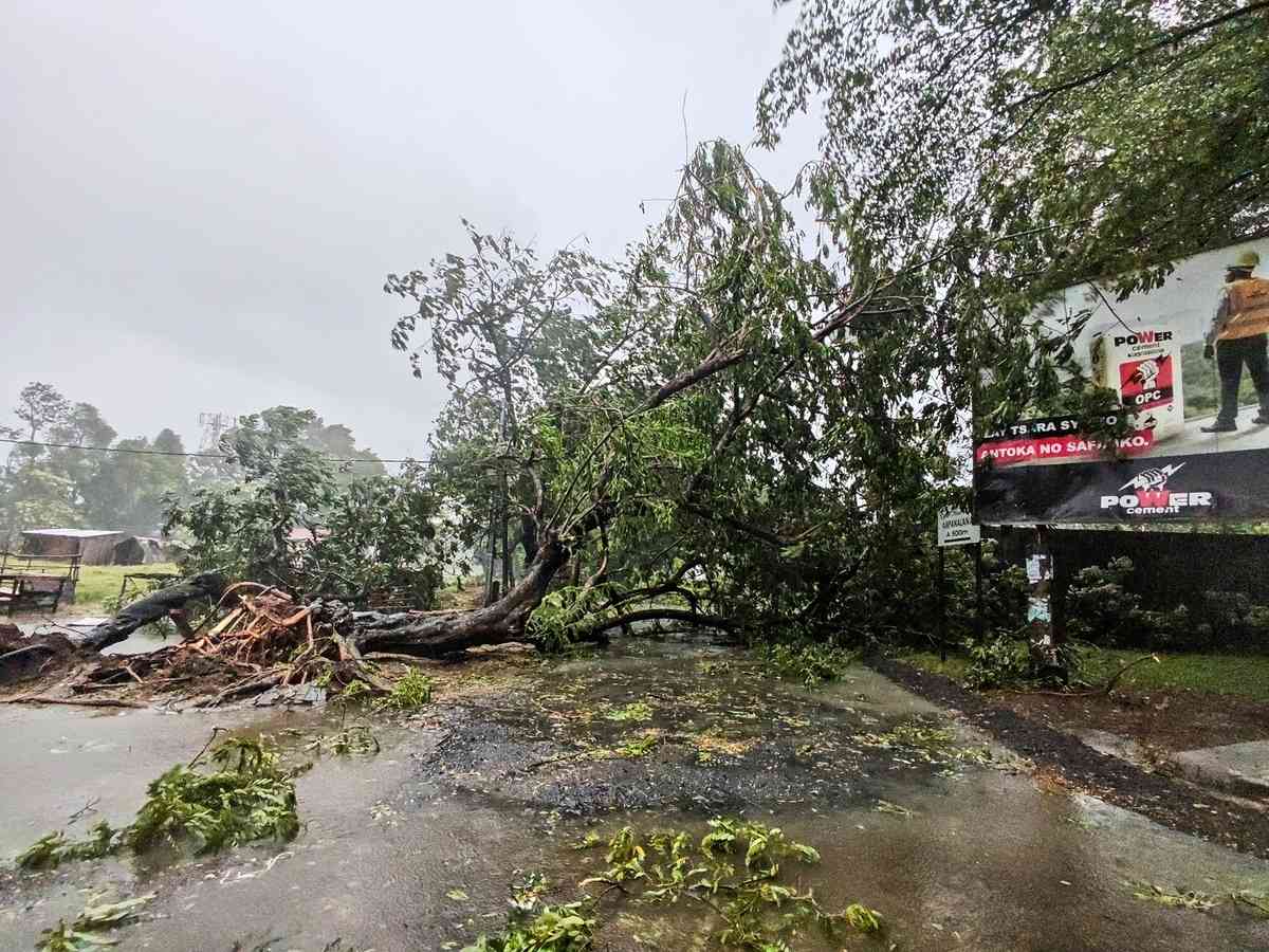 2026年2月11日,熱帶氣旋「格扎尼」(Gezani)過境後,馬達加斯加東部城市圖阿馬西納(Toamasina)的許多樹木被連根拔起。(Tsiky Sikonina/AFP via Getty Images)