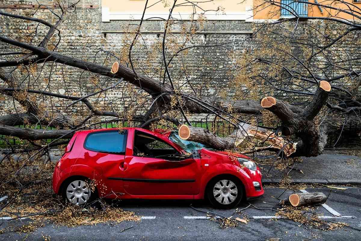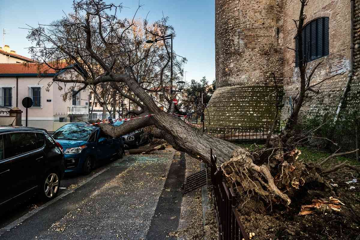 2026年2月12日,風暴「尼爾斯」(Nils)來襲期間,在東比利牛斯省(Pyrenees-Orientales department)佩皮尼昂(perpignan)市中心,一棵大樹被強風吹倒,砸中停靠在路邊的車輛。(Jc Milhet/Hans Lucas/AFP via Getty Images)