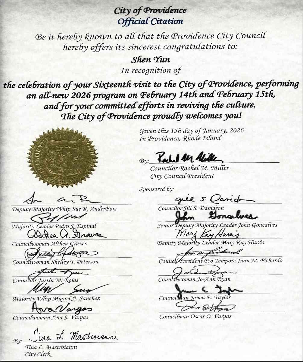 他們在褒獎中寫道:「謹在此宣布,普羅維登斯市議會,謹向神韻藝術團致上最誠摯的祝賀。特此表彰你們第十六次蒞臨普羅維登斯市,並於2月14日及15日獻上2026年的全新節目,以及你們為復興傳統文化所做的不懈努力。普羅維登斯市榮幸的歡迎你們!