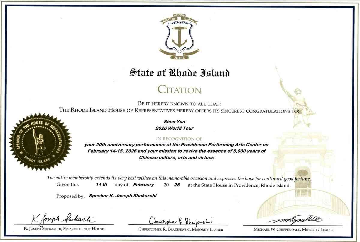 羅德島州眾議院在褒獎中寫到:「謹在此宣布,羅德島眾議院向神韻2026年世界巡演,致以最誠摯的祝賀。