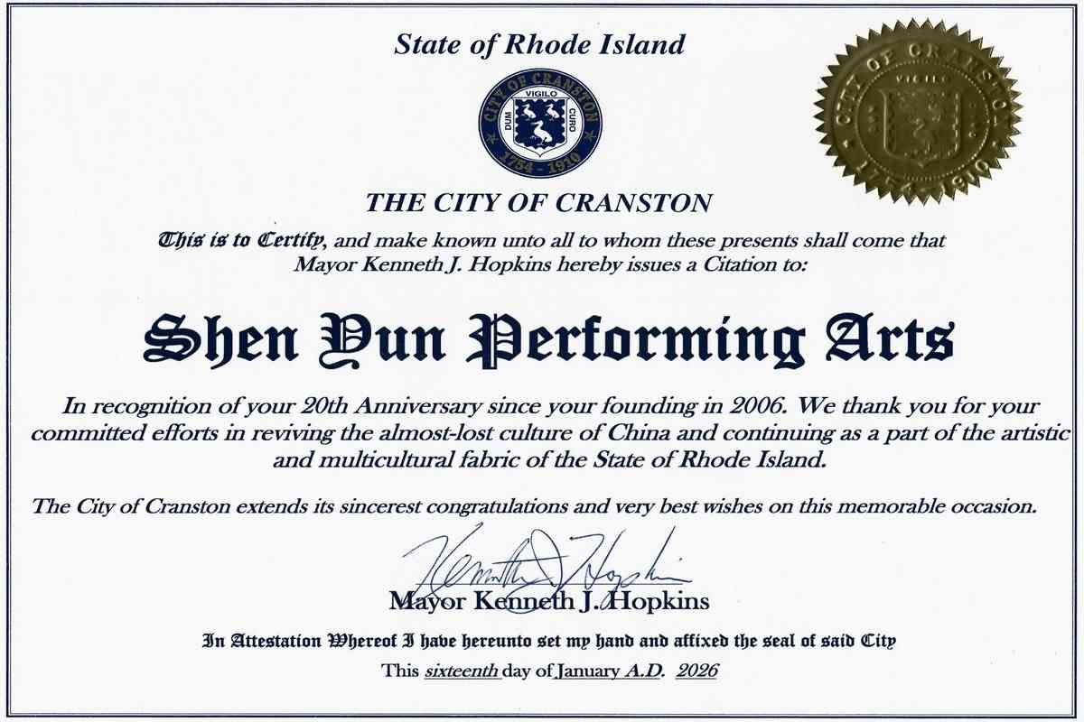「謹在此宣布,市長Kenneth J. Hopkins特此頒發嘉獎狀予:神韻藝術團,以表彰你們自2006年成立以來,值此成立20周年之際所取得的成就。感謝你們致力於復興幾乎失傳的中華傳統文化,並持續為羅德島州的藝術和多元文化發展作出貢獻。
