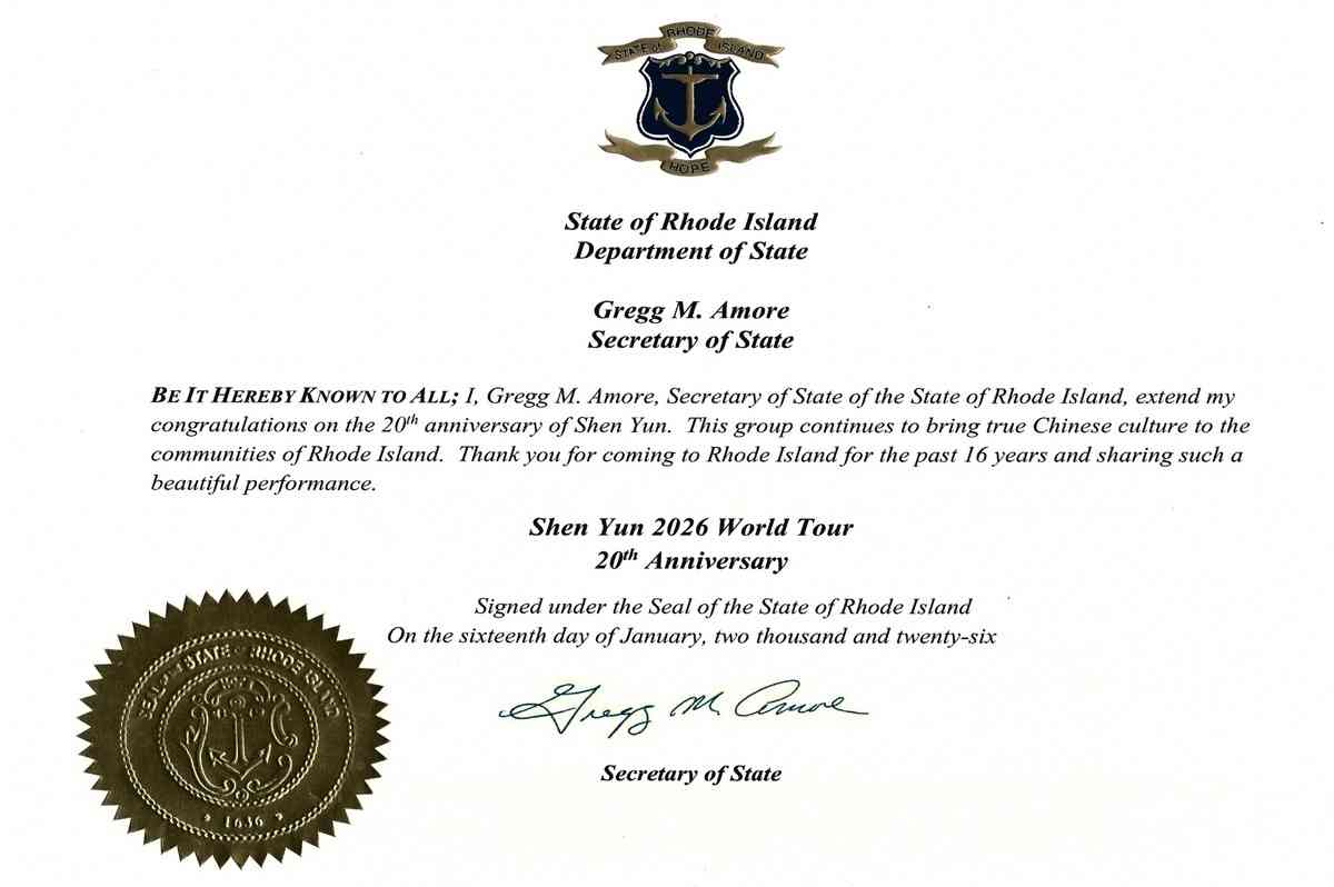 「謹在此宣布,我,羅德島州國務卿Gregg M. Amore,特此祝賀神韻藝術團成立20周年。你們持續將真正的中華文化帶給羅德島民眾。感謝你們在過去16年蒞臨羅德島,並帶來如此精彩的演出。」