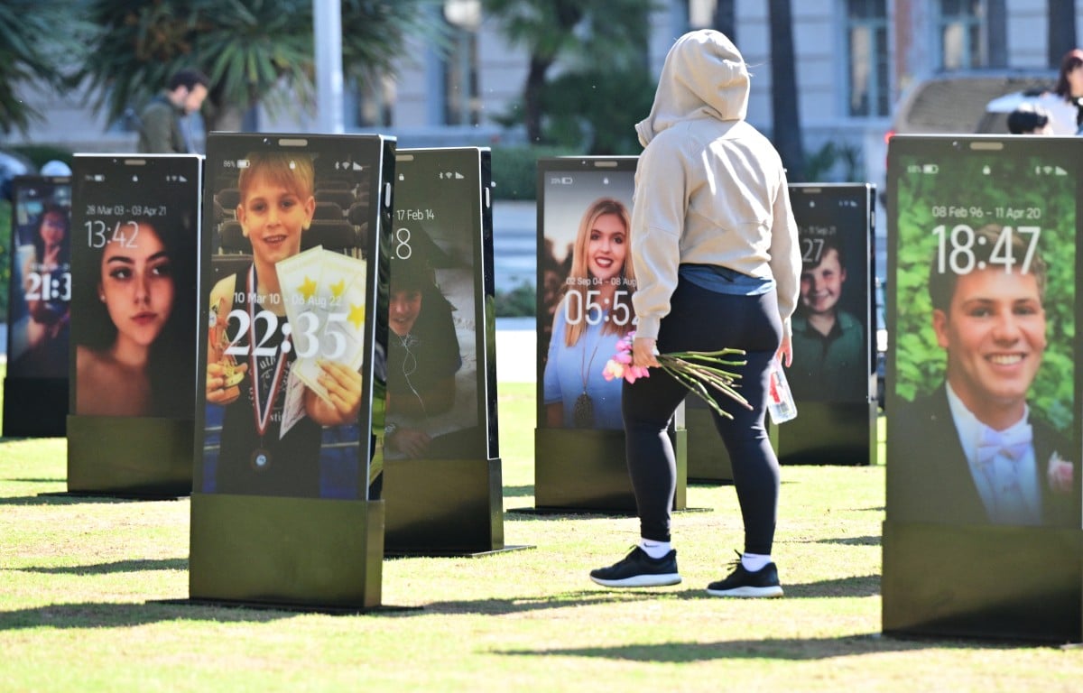 「近日,路過洛杉磯市中心,都能看到這50塊矗立在地上的手機模型。走到正面,每一個手機都代表一位,因為社交媒體而離開人世的年輕生命,以及一個破碎的家庭。」