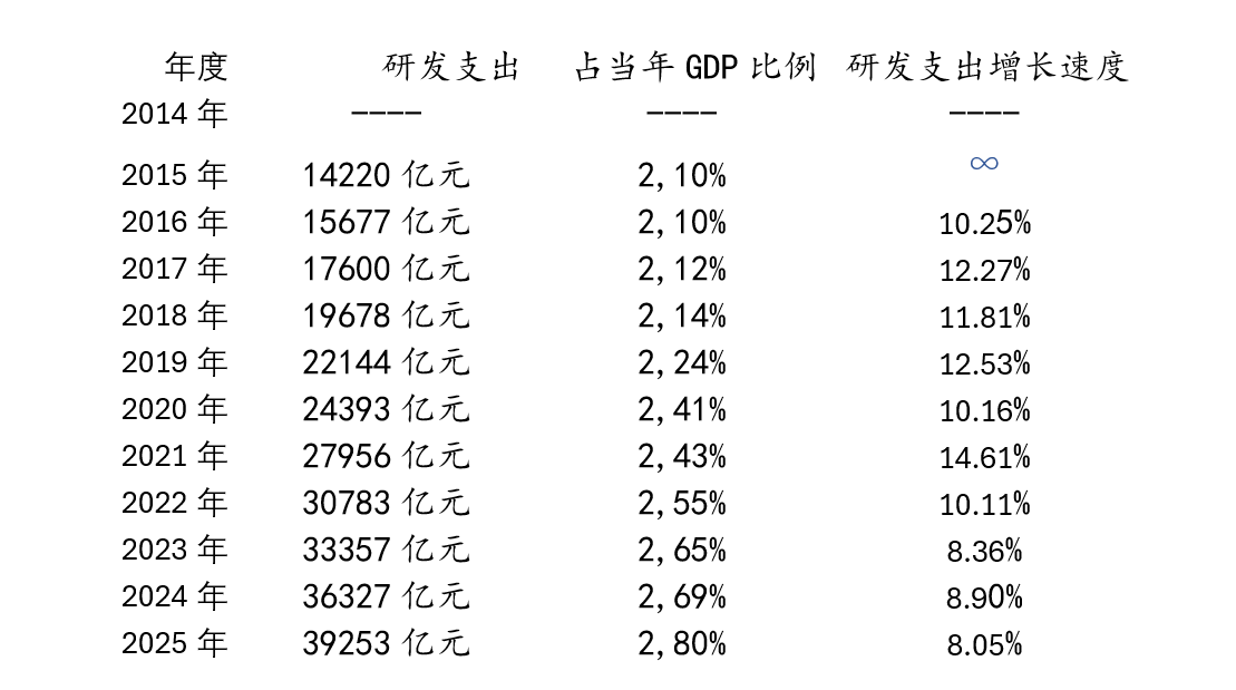 2016年國家統計局將研發支出(R&D)計入GDP,就是說,從2015年開始,每年中國的GDP起碼增加14,220億元以上。下面是2015年至2025年中國納入GDP統計的研發支出數據,以及佔當年GDP的比例: