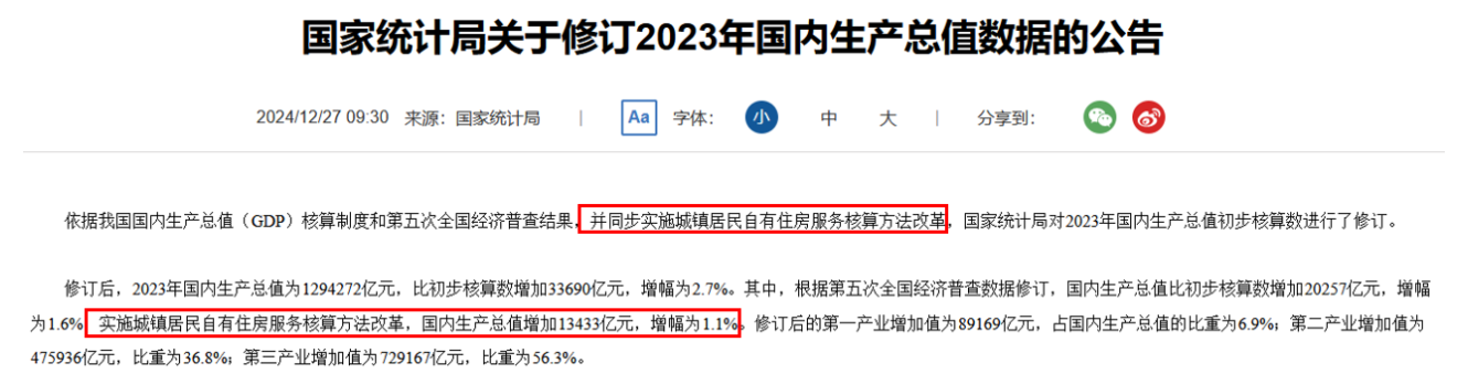 在2024年12月27日國家統計局修訂了2023年GDP數值稱,依據我國國內生產總值(GDP)核算制度和第五次全國經濟普查結果,並同步實施城鎮居民自有住房服務核算方法改革,國家統計局對2023年國內生產總值初步核算數進行了修訂。修訂後,2023年國內生產總值為1,294,272億元,比初步核算數增加33,690億元,增幅為2.7%。其中,根據第五次全國經濟普查數據修訂,國內生產總值比初步核算數增加20,257億元,增幅為1.6%;實施城鎮居民自有住房服務核算方法改革,國內生產總值增加13,433億元,增幅為1.1%。