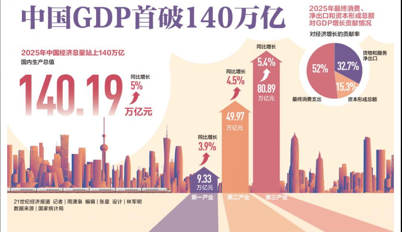 在2026年這個「十五五規劃」初始之年,中共官媒上的經濟「好消息」撲面而來。新華社記者王雨蕭、張曉潔報道,2026年1月19日國家統計局發布數據顯示,2025年中國國內生產總值(GDP)1,401,879億元,首次躍上140萬億元新台階,按不變價格計算,比上年增長5.0%。2025年初中共中央和國務院定下GDP增長5.0%的目標,一絲一毫不差地得以實現。