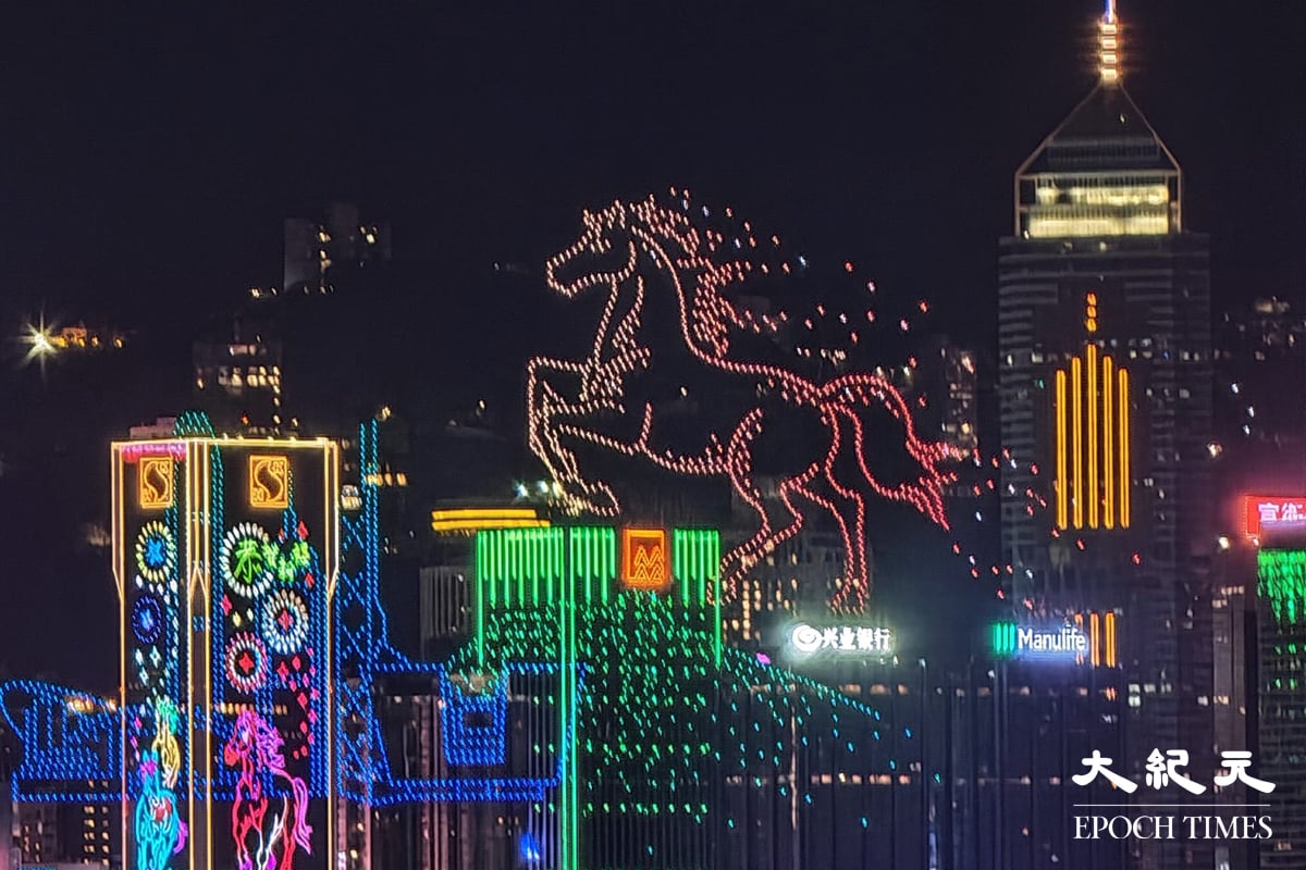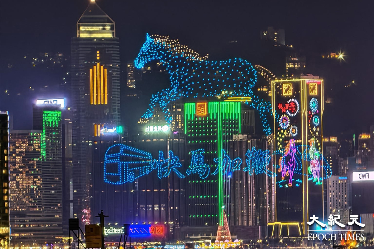 灣仔海濱公園昨晚(14日)上演賀中國新年無人機表演,晚上8時,2,026架無人機在維港上空升起,組成多款圖案,包括駿馬賀新年、馬匹跨越青馬大橋、灣仔會展等地標,以及「龍馬精神」、「快馬加鞭」等祝賀字句。主辦方說,今次為本地歷來最大規模的無人機表演。