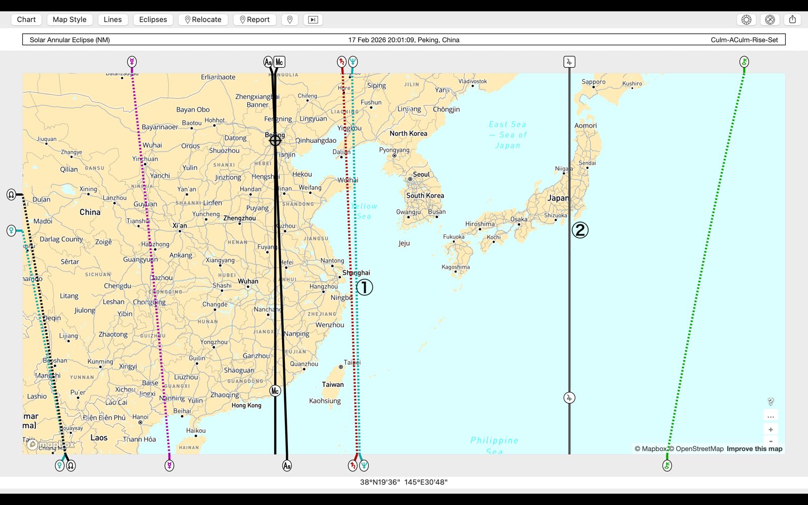 ① 土星及海王星的線路並行,並延伸至華東地區外的東海,上海為其中一個受影響的地區。由於土星代表土地與結構,而海王星則象徵瓦解與消散,本月11日上海閔行區七莘路在建地鐵工地因施工滲漏而引發大面積路陷的事件,正好對應這一組行星能量。因此,在該線附近的地區(如中國東北及台灣)需特別留意與土地、建築物,甚至制度結構相關的不穩定情況,嚴重者或出現崩塌性的災難。
