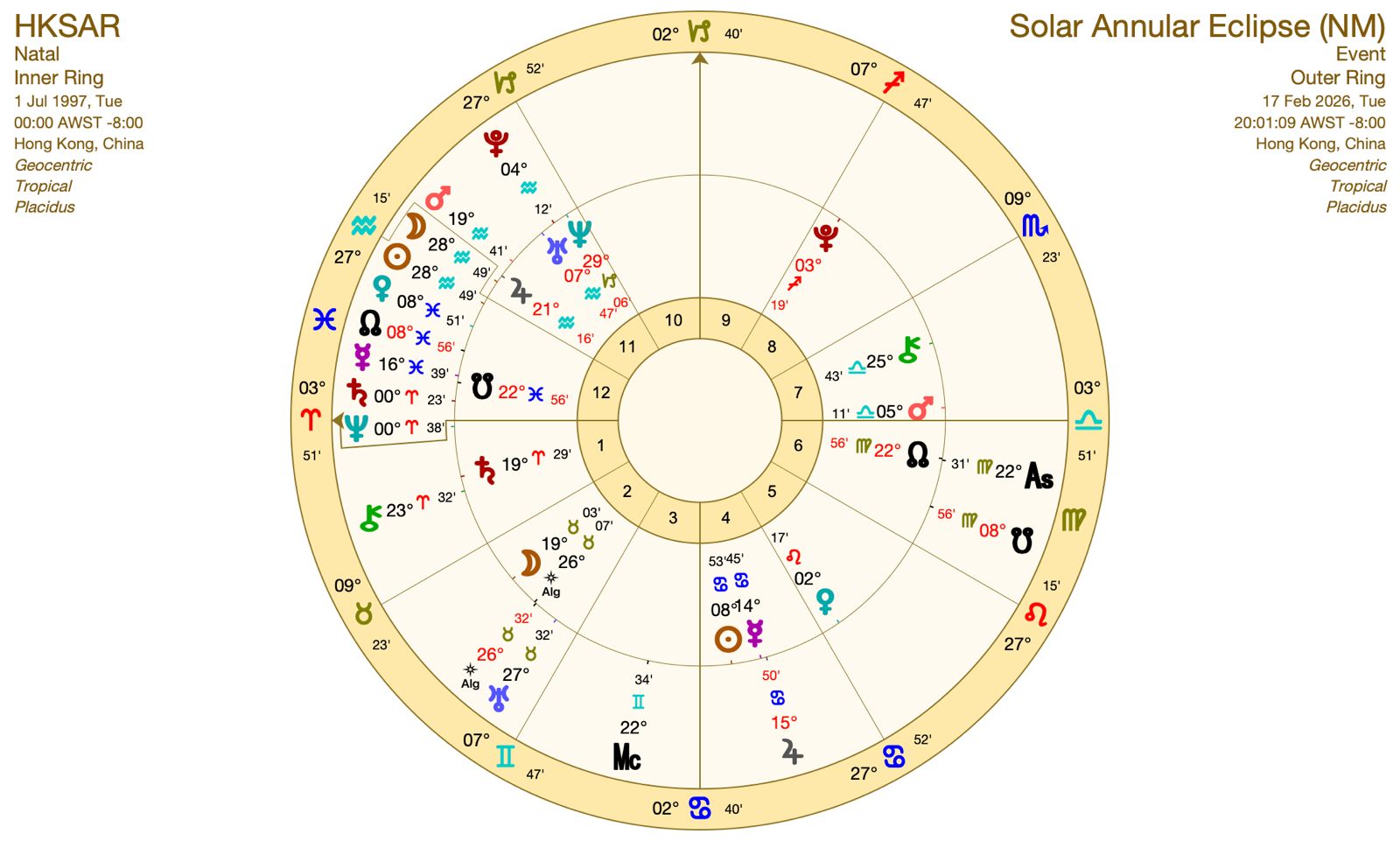 未解釋上述兩地的運勢之前,先留意日蝕當日的占星地圖(圖1)。讀者可留意其中兩個部份: