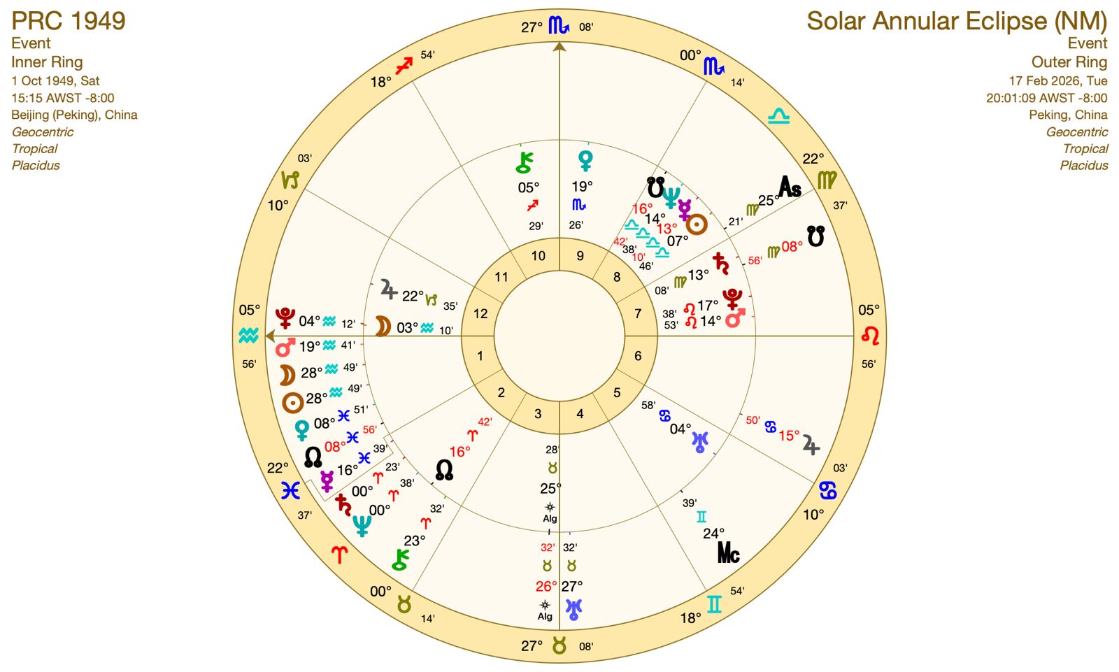 五、象徵毀滅、控制與恐懼的冥王星(水瓶座)長期與上升點及代表人物的月亮(水瓶座)合相;同時,代表顛覆與不穩的天王星(金牛座)與天底形成合相。換言之,即使在資訊受限的情況下,外界難以全面理解內地社會狀況,但可以推斷,政權即使持續對外擴張,其結果或僅帶來更多損失,而內部社會則可能持續走向更深層的不穩與下行。