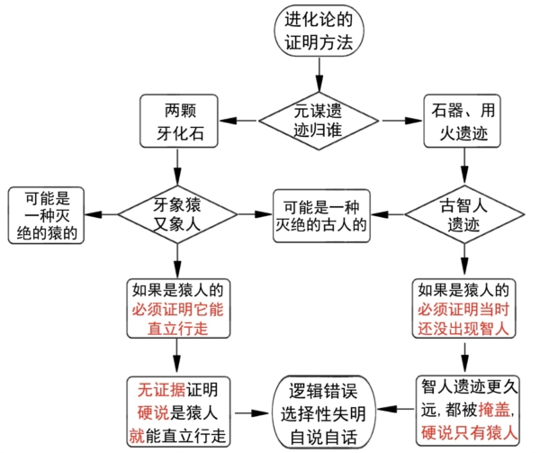 上圖展現的元謀猿人認定思維流程圖,展現了進化論的一貫邏輯欺騙:排除其它一切可能,只認準自己設想的可能性,又拿不出任何證明,用欺騙去糊弄,這樣就能發論文,就能出科研成果。其實所有「猿人」都是這樣幹的,較真起來,至少都是邏輯欺騙(有的還用實物造假、研究造假、辭令造假),而中國的「猿人」,把這種邏輯欺騙的學術演繹到頂峰。兩個牙齒,沒有任何科學的證據,就能憑想像「復原」一群「能直立行走」「會用火」「會打制石器」的元謀「猿人」!
