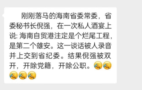 習近平親自策劃部署的所謂「海南自由貿易港」,在2025年12月18日開始正式啟動全島封關。近日網絡熱傳:倪強因酒後吐真言,稱海南自貿港會註定是一個爛尾工程,是第二個雄安。不想這段談話被人偷錄了上交到省紀委,倪強因此被雙開。