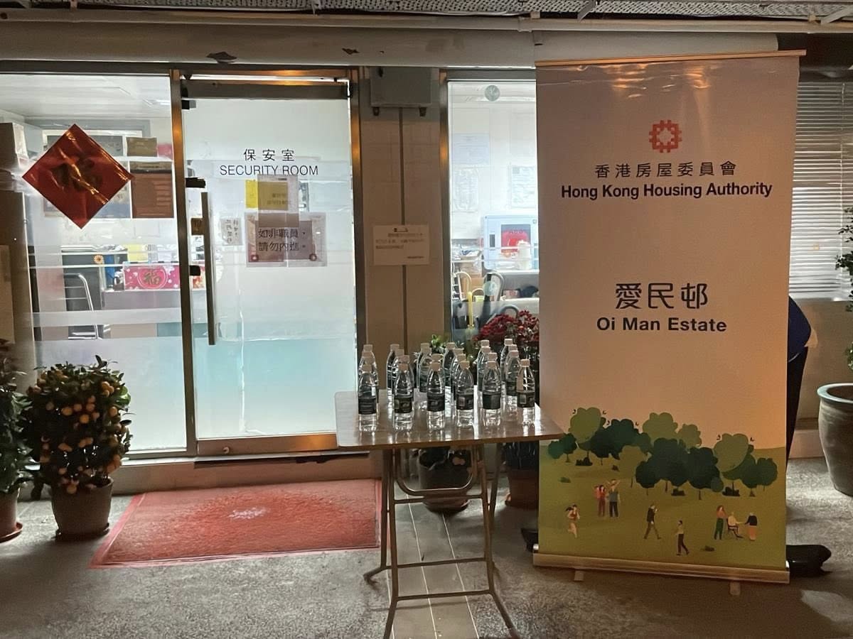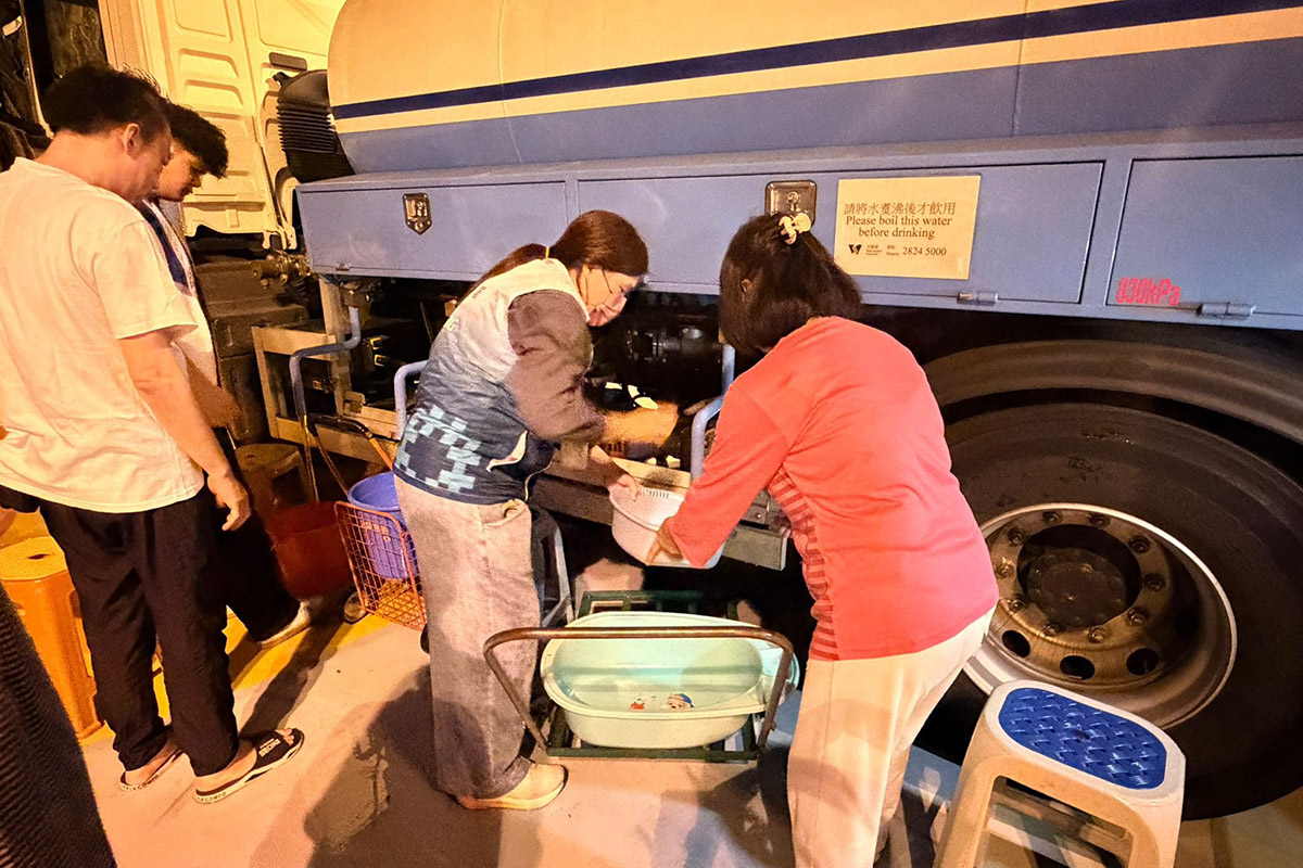 水務署已即時安排緊急維修工程 ,並安排水車到場協助街坊取用食水;房委會亦向居民派發樽裝水。